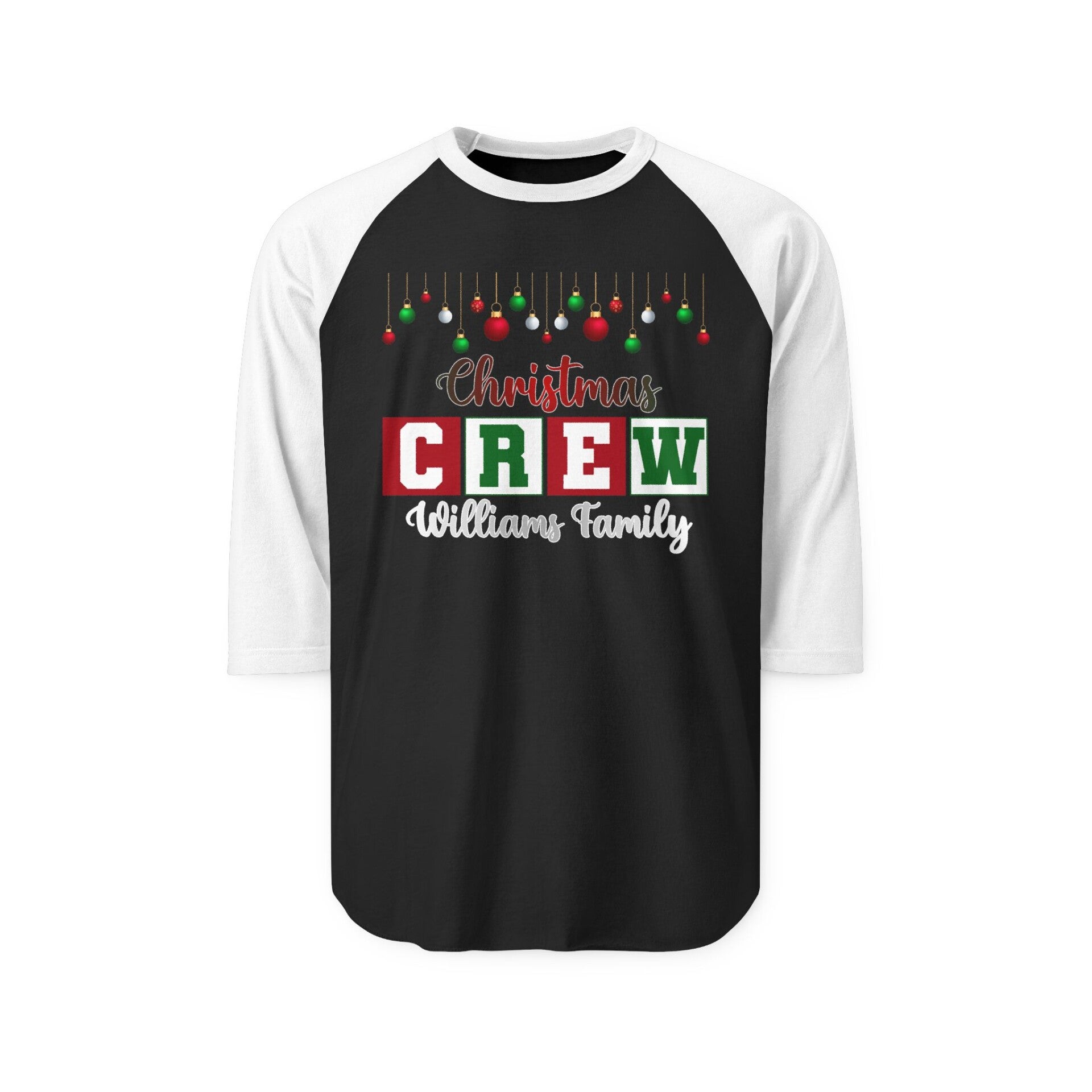 Each shirt is personalized with your family name for a one-of-a-kind touch that makes your crew stand out. Designed with classic red and green holiday colors and cute ornament details, this shirt is a fun keepsake you’ll wear year after year!